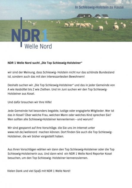 NDR 1 Welle Nord sucht die "Top Schleswig-Holsteiner" aus Kosel